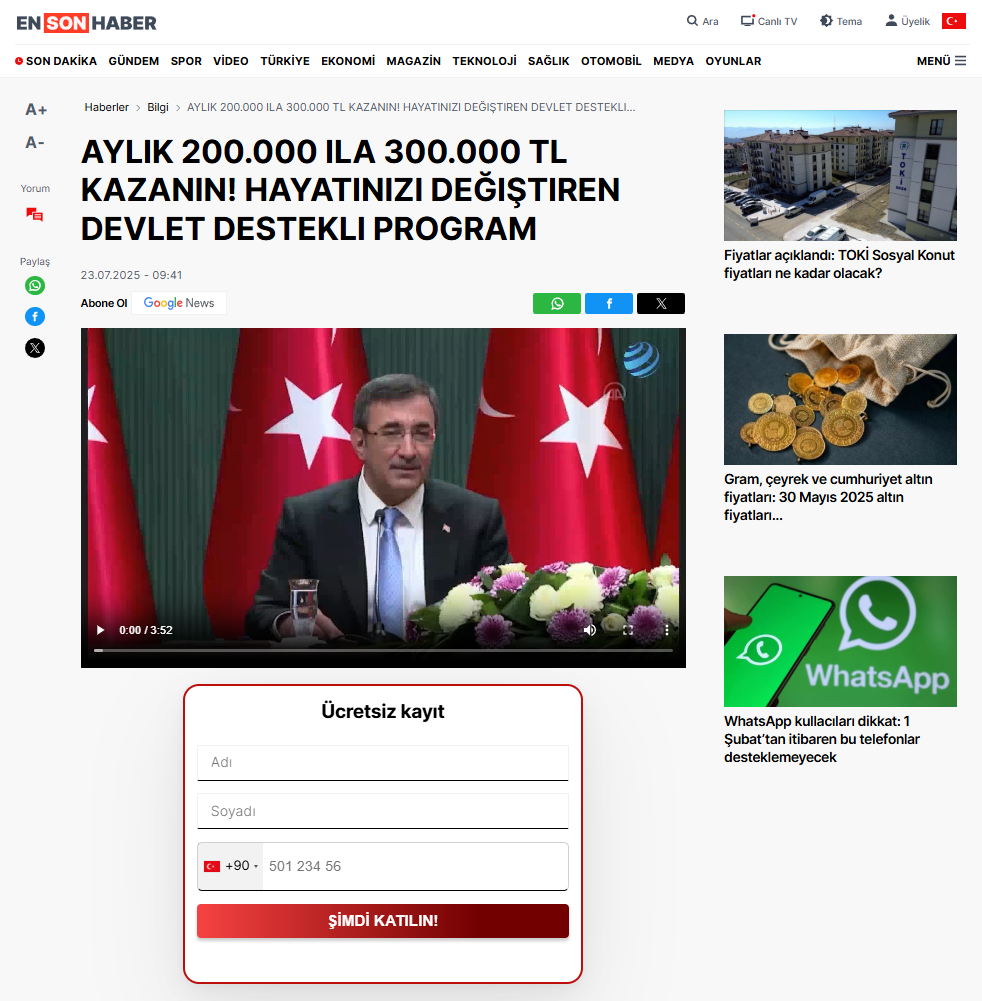 Dolandırıcılar, sosyal medya videolarından sonra kullanıcıları, bilindik haber sitelerinin görsel tasarım ve logosu kopyalanmış fakat alan adları genellikle anlamsız, saçma ve orijinaline hiç benzemeyen sahte web sitelerine yönlendiriyor. Bu sitelerde kullanıcıdan isim, soyisim ve özellikle telefon numarası talep ediliyor. Ardından, genellikle yurtdışı numaralardan WhatsApp aracılığıyla arama yapılarak kurbanlara “broker” ya da “yatırım danışmanı” olarak tanıtılan kişiler, acil ve hızlı hareket etmeleri gerektiğini söyleyerek yatırım yaptırmaya çalışıyor.